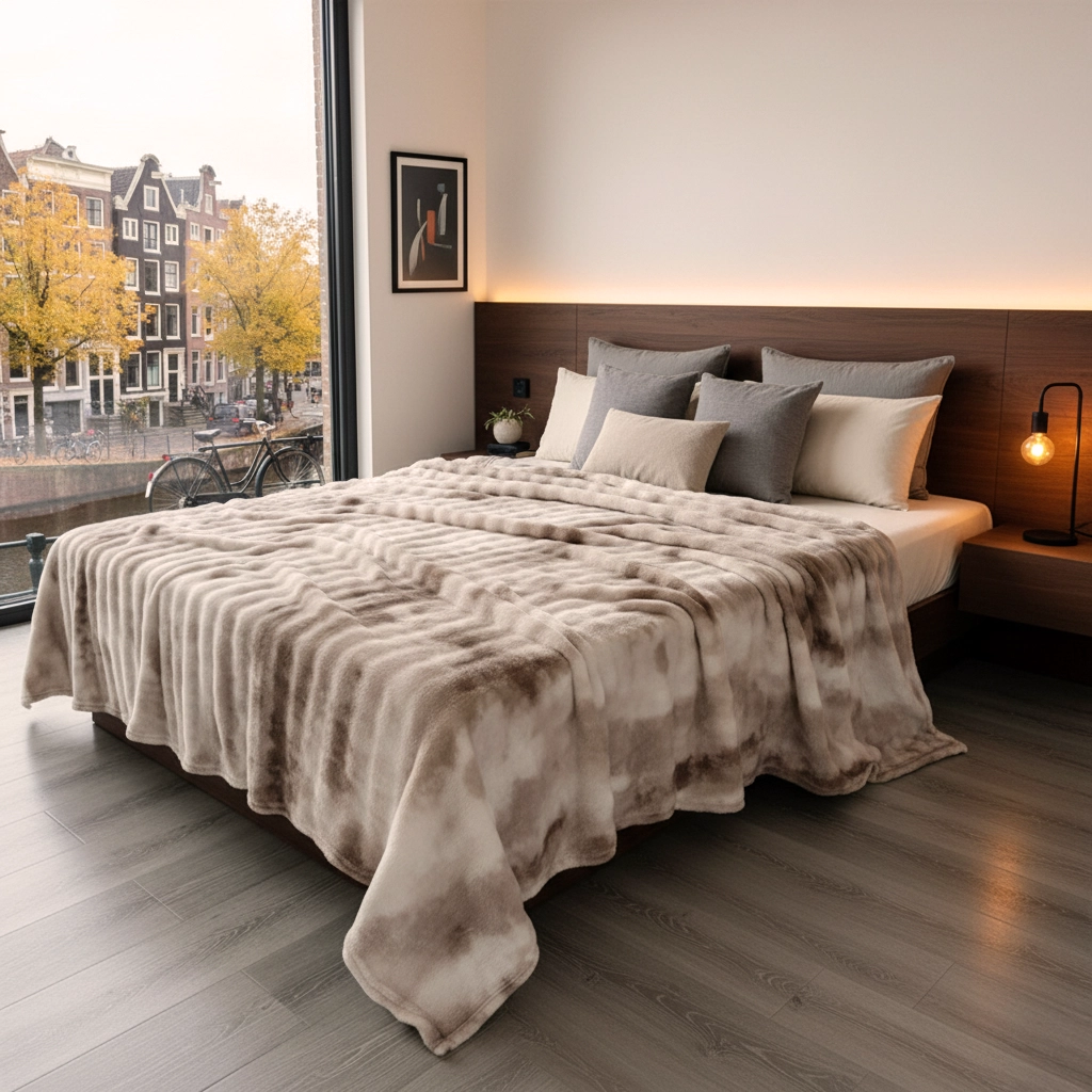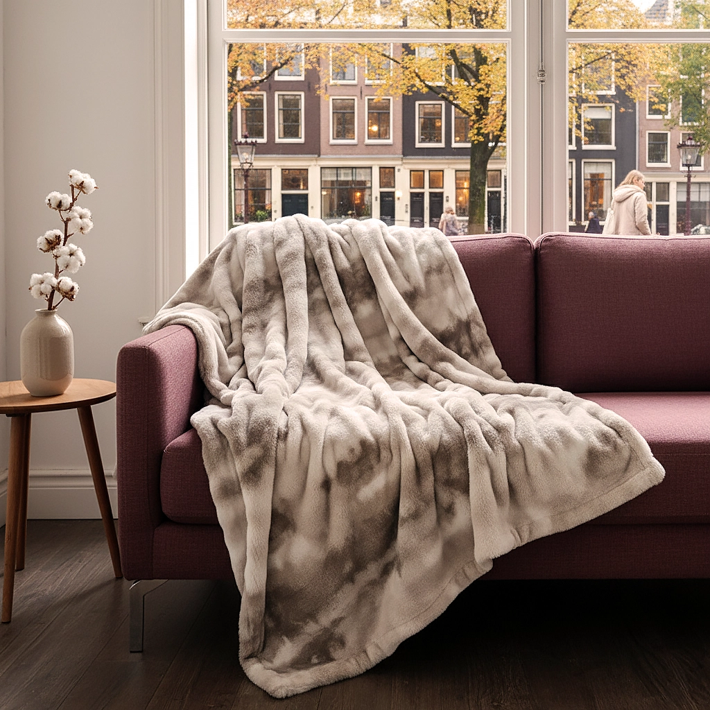 Ervaar het perfecte samenspel van stijl en comfort met onze luxe zachte fleece plaid. Met zijn verfijnde faux fur look voegt deze plaid een vleugje elegantie toe aan elke woonkamer of slaapkamer. De subtiele kleurvariaties passen moeiteloos in diverse interieurstijlen, terwijl de zijdezachte textuur direct uitnodigt tot ontspannen. Ideaal om op koude dagen om je heen te slaan of decoratief over je bank te draperen.